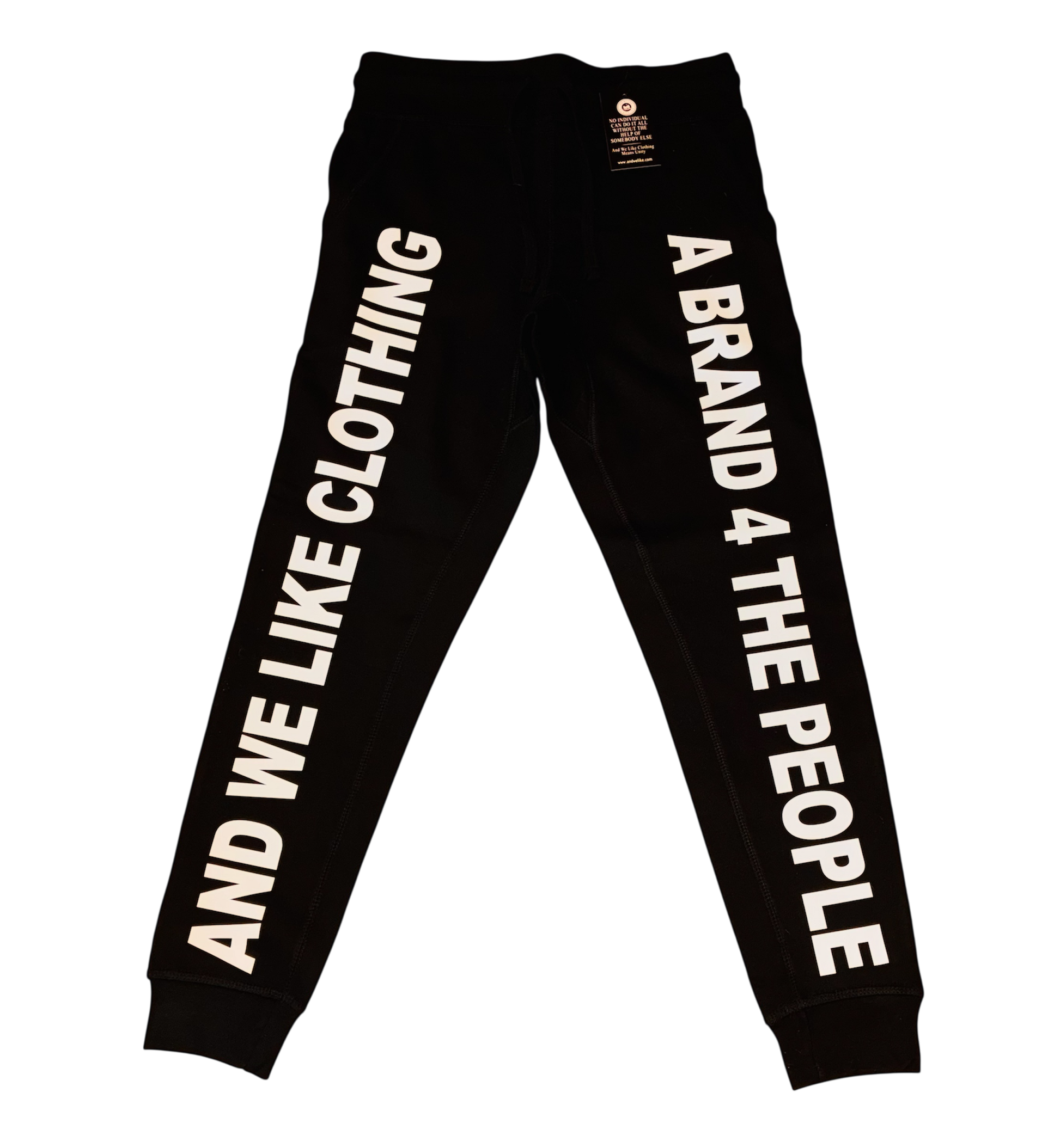 Streetwear comfort meets bold design. Premium joggers with And We Like Clothing + A Brand 4 The People prints down each leg. Available in black & navy. Limited stock.