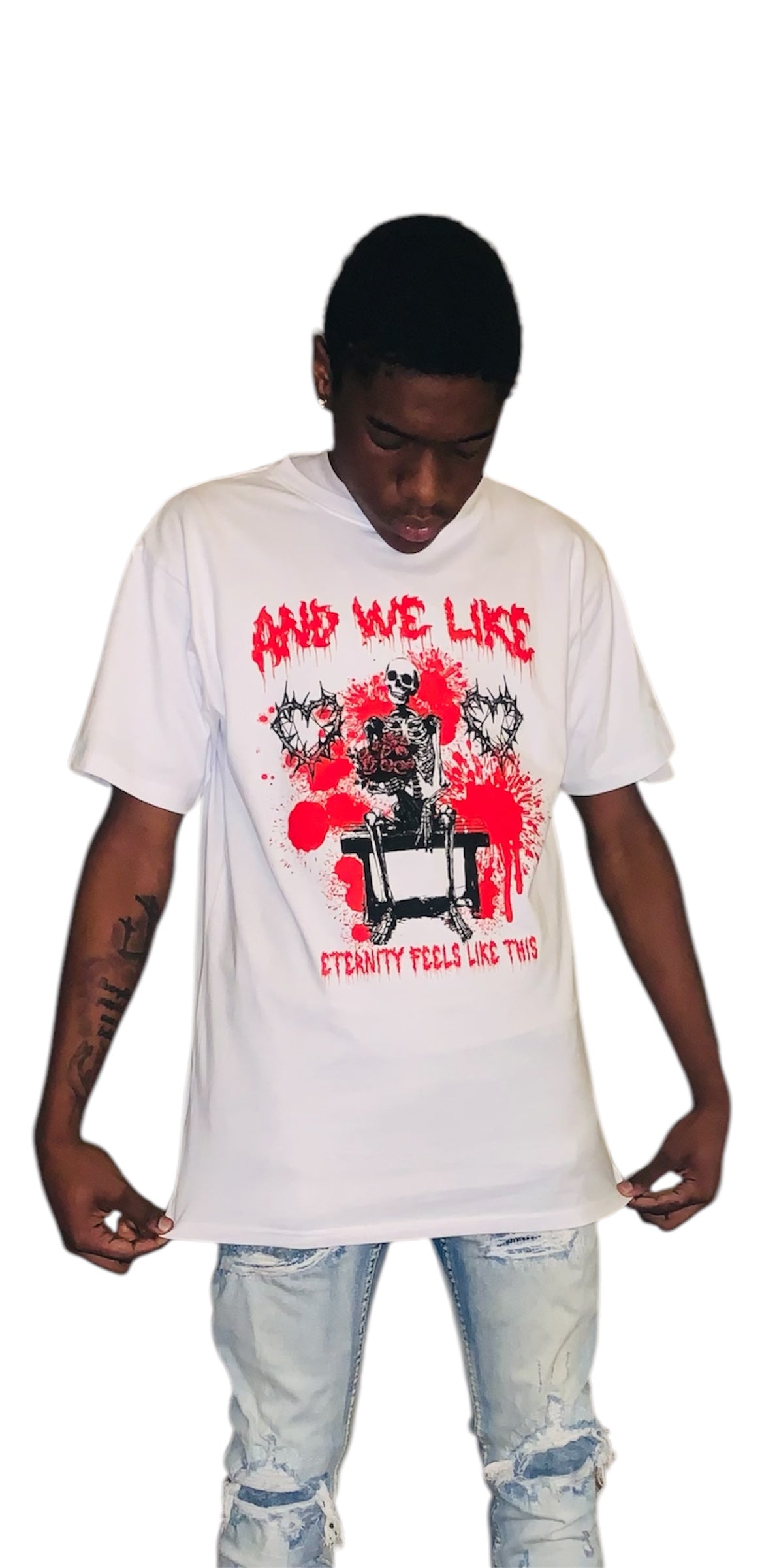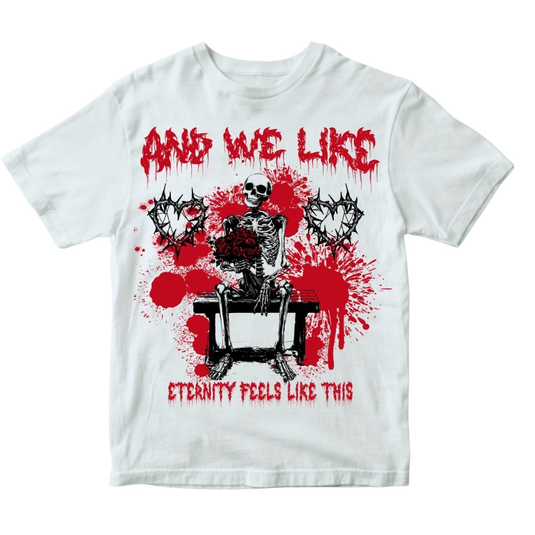 This t-shirt features a gothic design with a seated on a bench, surrounded by red blood splatter graphics. The text “AND WE LIKE” is written in bold, drippy red lettering at the top, while “ETERNITY FEELS LIKE THIS” is displayed at the bottom in a similar style. The design includes barbed heart illustrations on either side of the skeleton, contributing to its dark and edgy aesthetic. Pre-Order today.